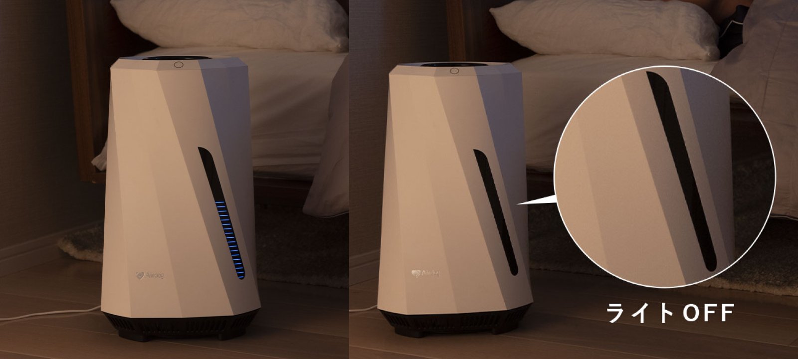 長時間ゆっくり加湿するエアドッグ モイなら、睡眠中も肌や髪の適度な保湿ができるので、起床時の乾燥を感じることも少なくなります。スリープモードを使えば、ディスプレイパネルとインジケーターのライトが消えて睡眠の邪魔にもなりません。